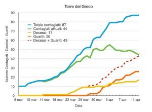 “Ho aggiunta una nuova linea – spiega Sasso – , quella rosso scuro tratteggiata. E’ la somma tra guariti e decessi e quasi eguaglia quella degli attuali contagiati, quindi dovremmo essere al picco della pandemia a Torre (uno dei due modi di misurare i picchi, già ne abbiamo parlato), anche se dobbiamo vedere i dati dei prossimi giorni per esserne sicuri.