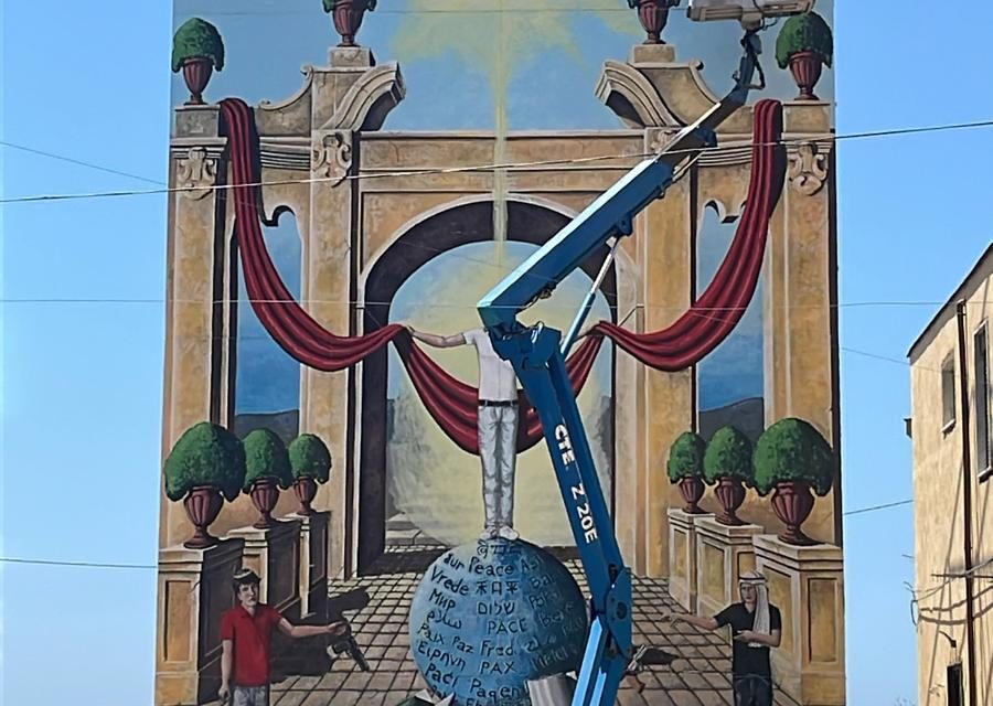 Al centro della scenografia l’artista ha messo “un uomo che potrebbe essere inteso sia come il Cristo che come un moderno uomo vitruviano che sovrasta un globo su cui è incisa la parola Pace in differenti lingue. Due bambini di diverso credo religioso, ai lati della composizione, gettano via le armi, rifiutandosi di utilizzarle. Lo scenario è quello suggestivo di Villa Prota”.