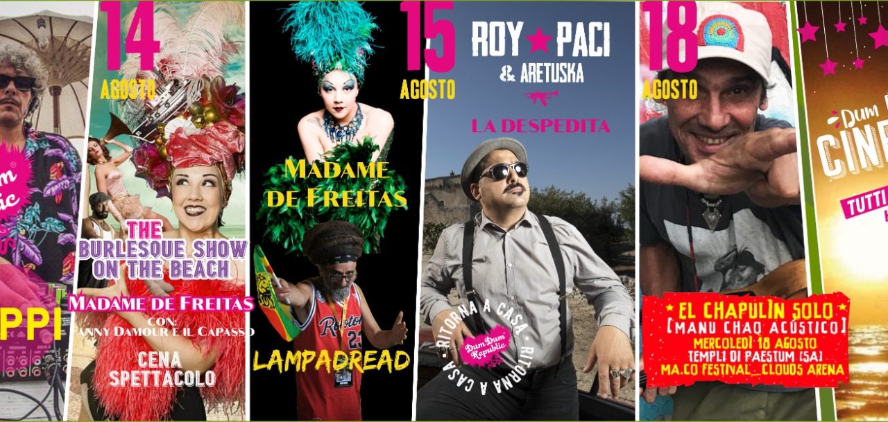 L’arena che sorge sul mare si aprirà il venerdì 13 agosto con la patchanka made in Puglia di Tuppi; sabato 14 tutta la magia del Burlesque proietterà il Dum Dum Republic nella Belle Èpoque per la cena spettacolo “The Burlesque Show on Tne Beach” in spiaggia con Madame De Freitas con Fanny Damour e Il Capasso; domenica 15 agosto il grande party d’estate conl’opening affidato a Madame de Freitas (versione Djette stavolta) con LampaDread pioniere del reggae e della musiva in levare in Italia, mentre di sera grande attesa per il concerto del capitano del Dum Dum, Roy Paci & Aretuska con La Despedida Tour. Mercoledì 18 agosto il Dum Dum Republic, in collaborazione con il Maco Festival, si trasferisce ai Templi di Paestum, alla Clouds Arena per il concerto dell’icona internazionale Manu Chao in “El Chapulin Solo” live in acustico.