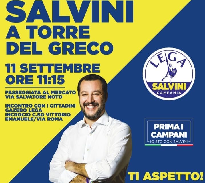 Torre del Greco – Venerdì 11 settembre, come preludio al comizio che terrà a Napoli a Piazza Matteotti alle ore 18, il leader della Lega Matteo Salvini, alle ore 11.15, farà tappa a Torre del Greco per conoscere la città ed i cittadini torresi, con un passaggio nello storico mercato al Largo Santissimo, conosciuto ai più con il nome di Piazzetta, per apprezzare le tradizioni ed i costumi della quarta città della Campania, e poi proseguire verso l’incrocio Corso Vittorio Emanuele/Via Roma, altezza fontana, per un saluto a tutta la città.