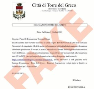 La lettera, realizzata su una carta intestata palesemente contraffatta ma che riporta il logo e la dicitura “Città di Torre del Greco” e in calce la scritta “Il Sindaco Luigi Mennella” (pur mancando di firma autografa o anche solo del richiamo ad un’eventuale sottoscrizione in forma digitale), riporta in oggetto un non meglio precisato “Piano di evacuazione Torre del Greco”.